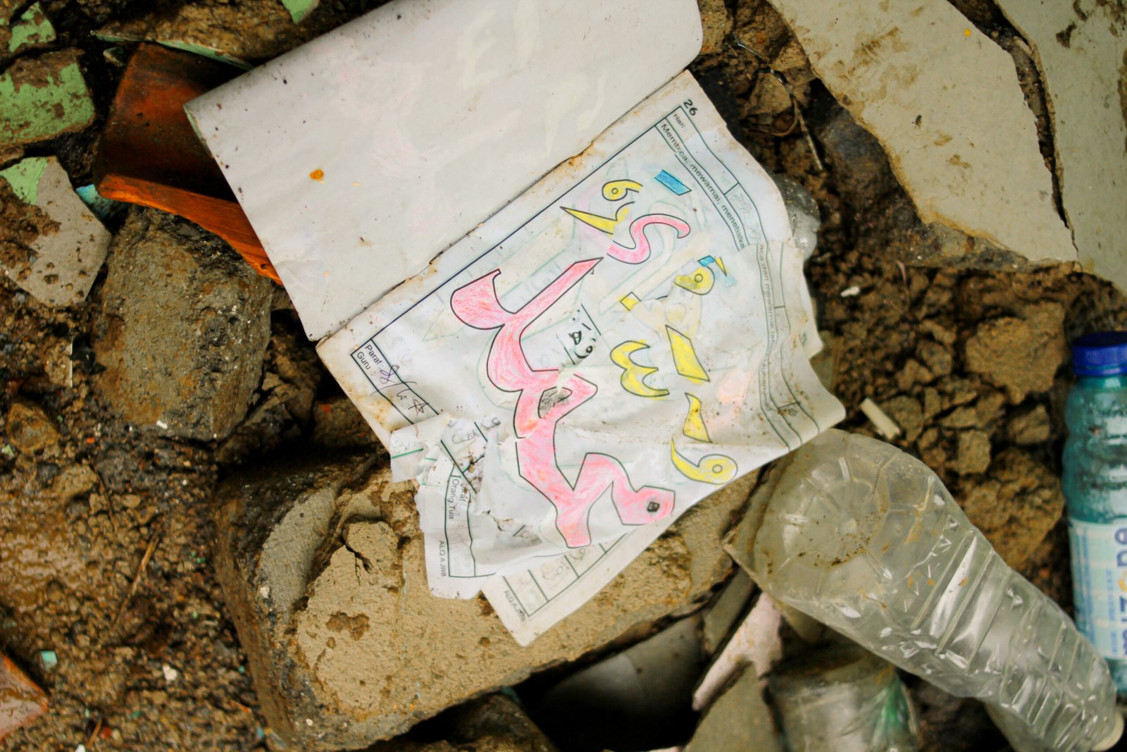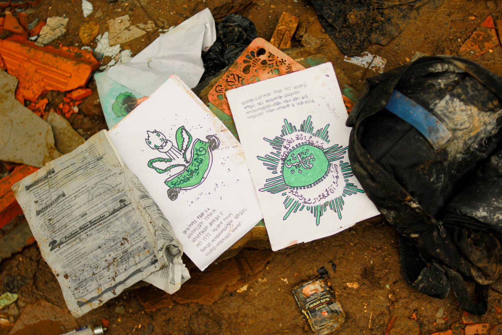 Buku mereka basah dan robek. Tas sekolah tertimbun lumpur. Alat tulis hanyut terbawa material longsor.